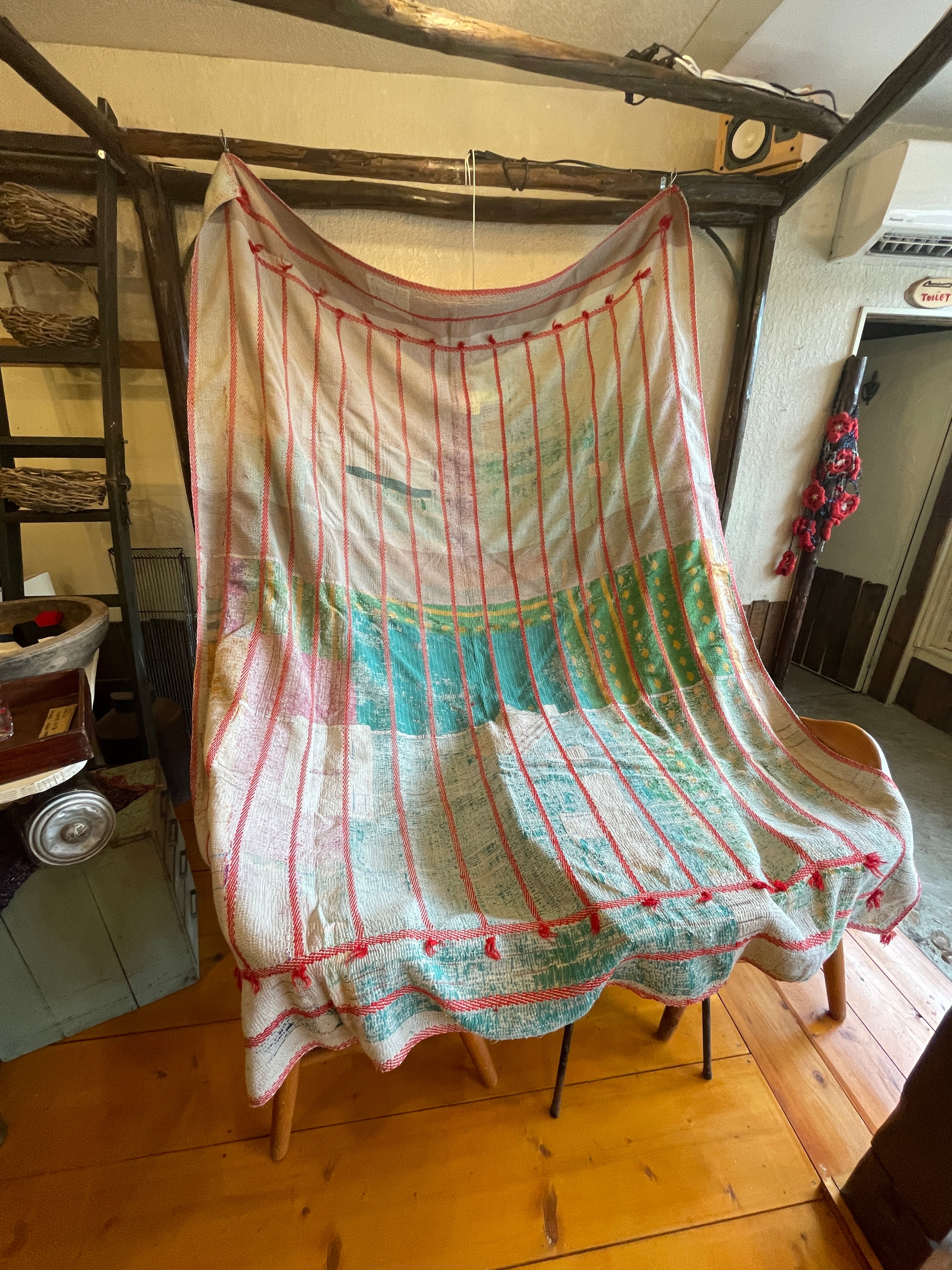 インド製ヴィンテージカンタラリーキルト レア大判赤ステッチベットカバー